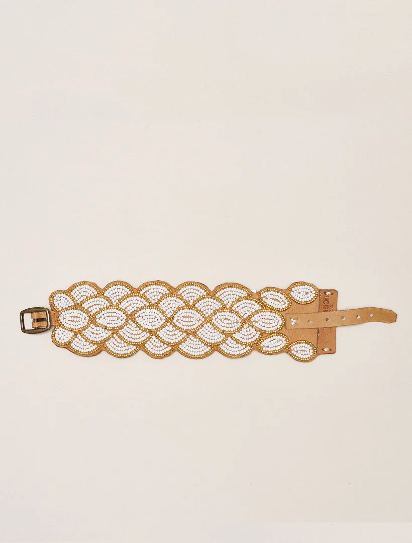 Wave Leather Beaded Cuff Bracelet Gold White